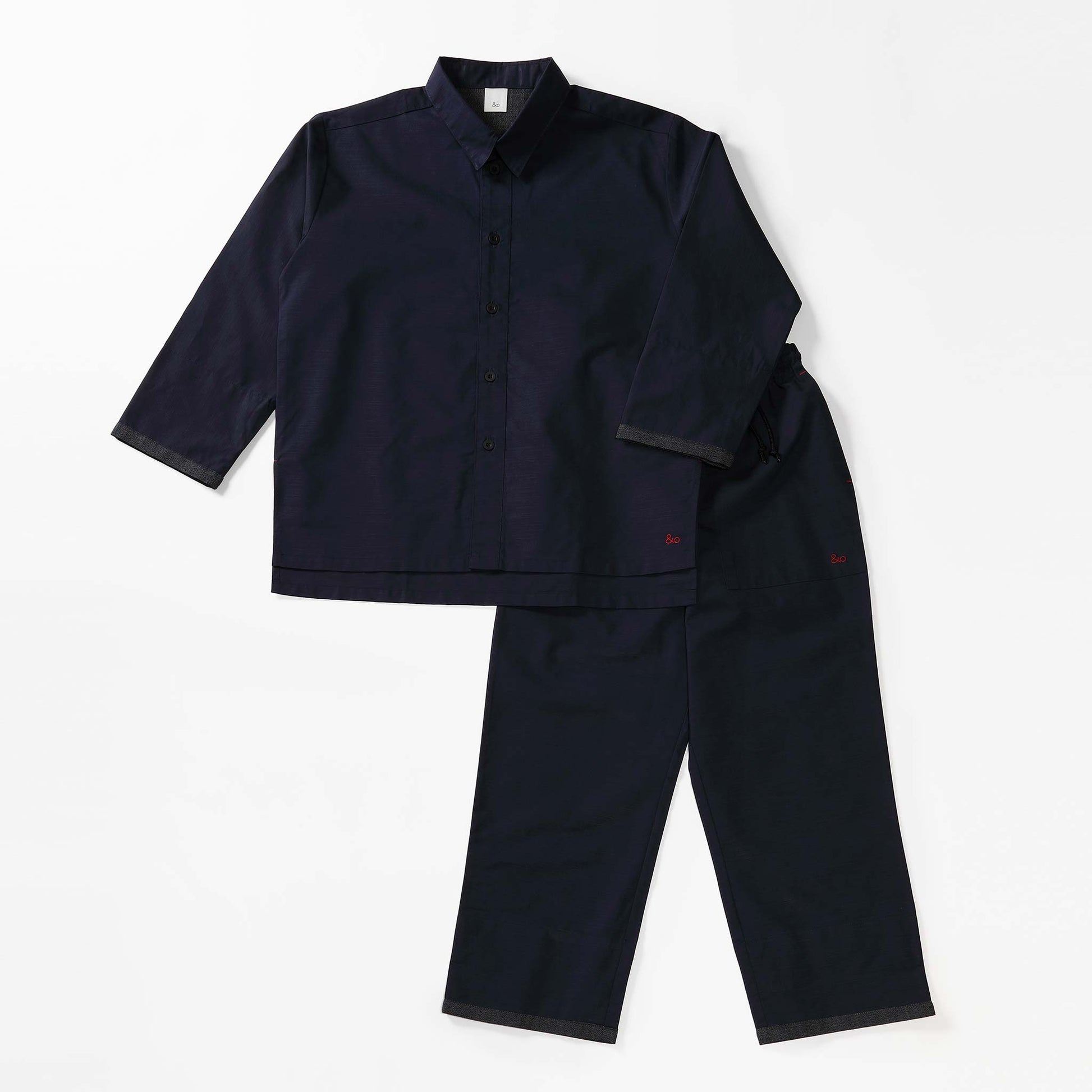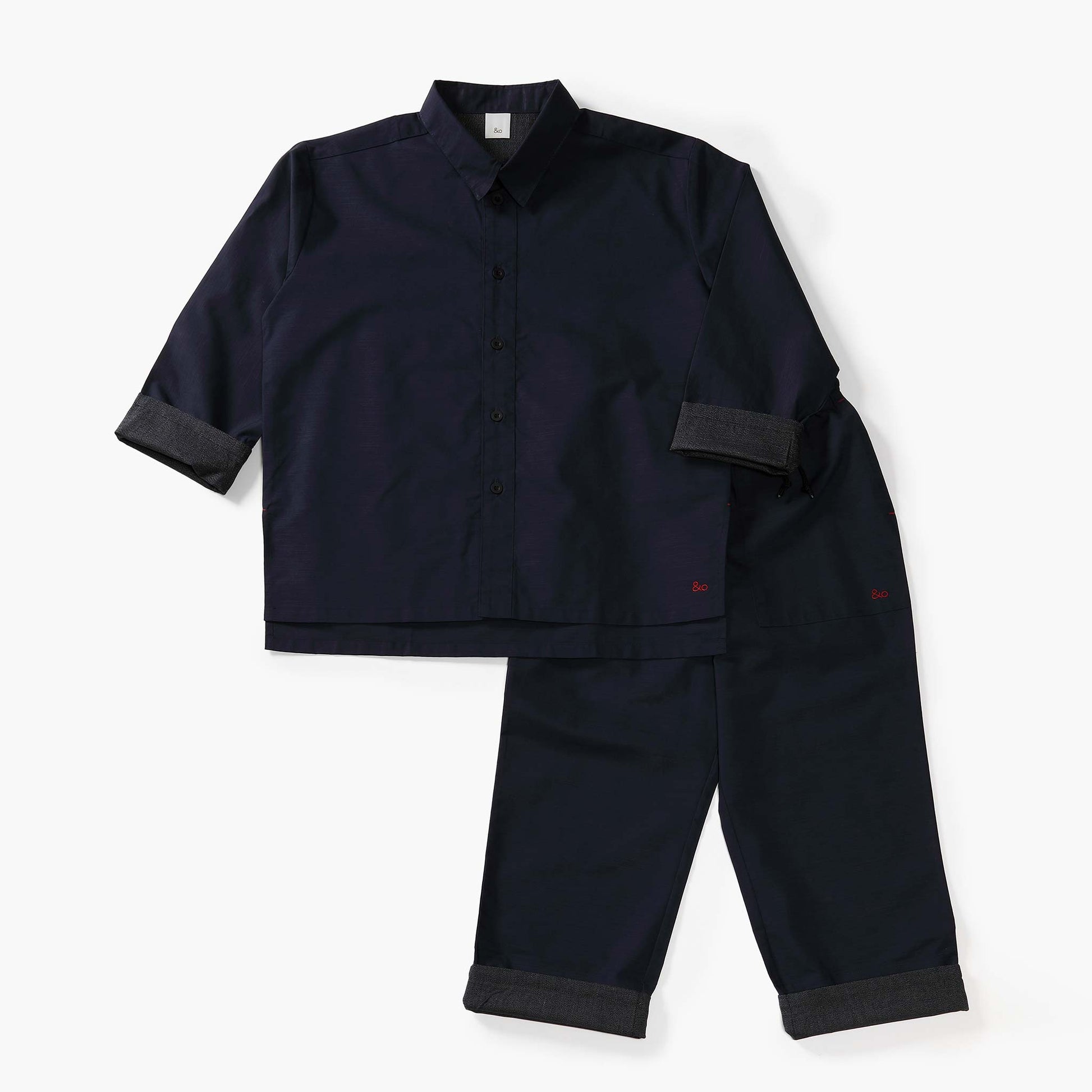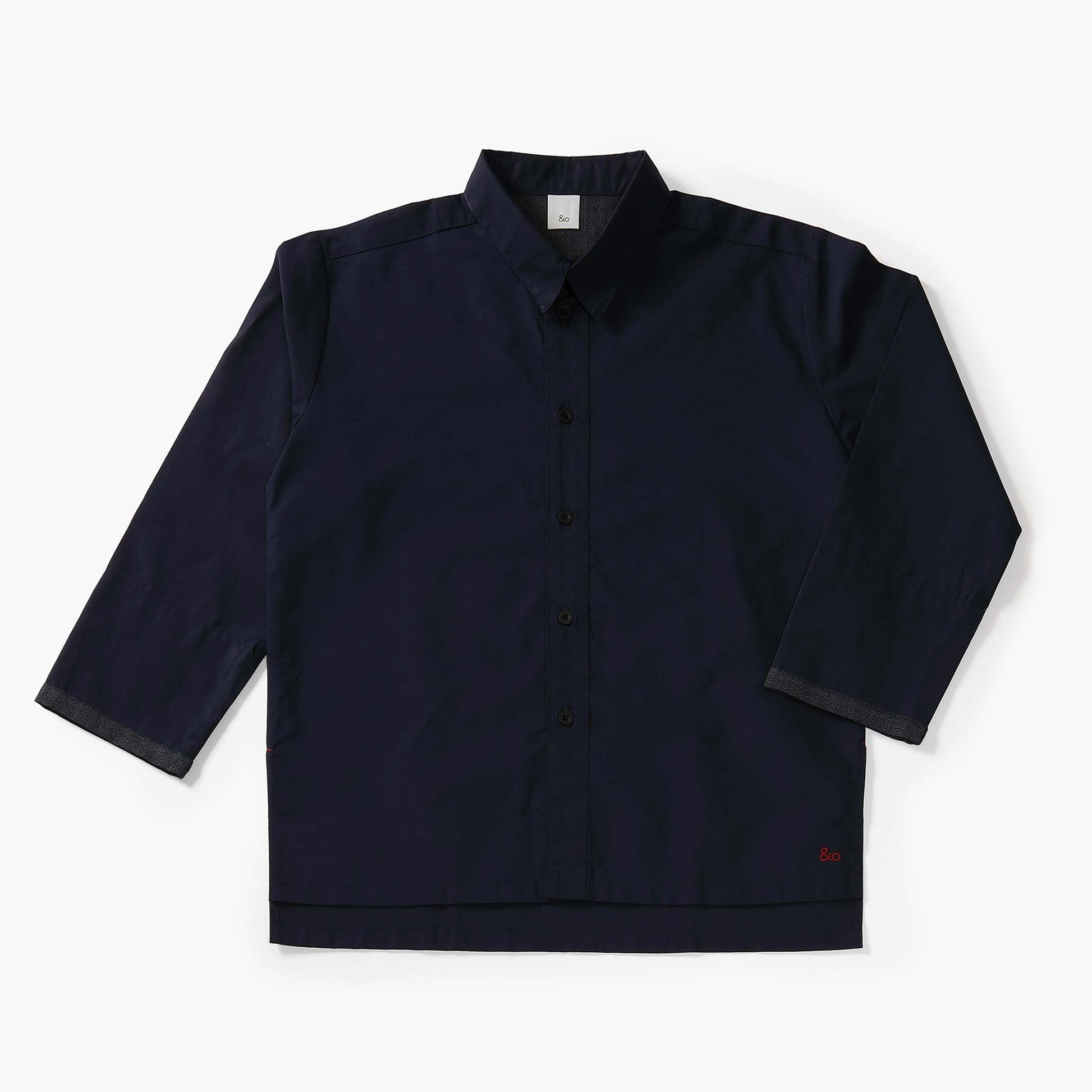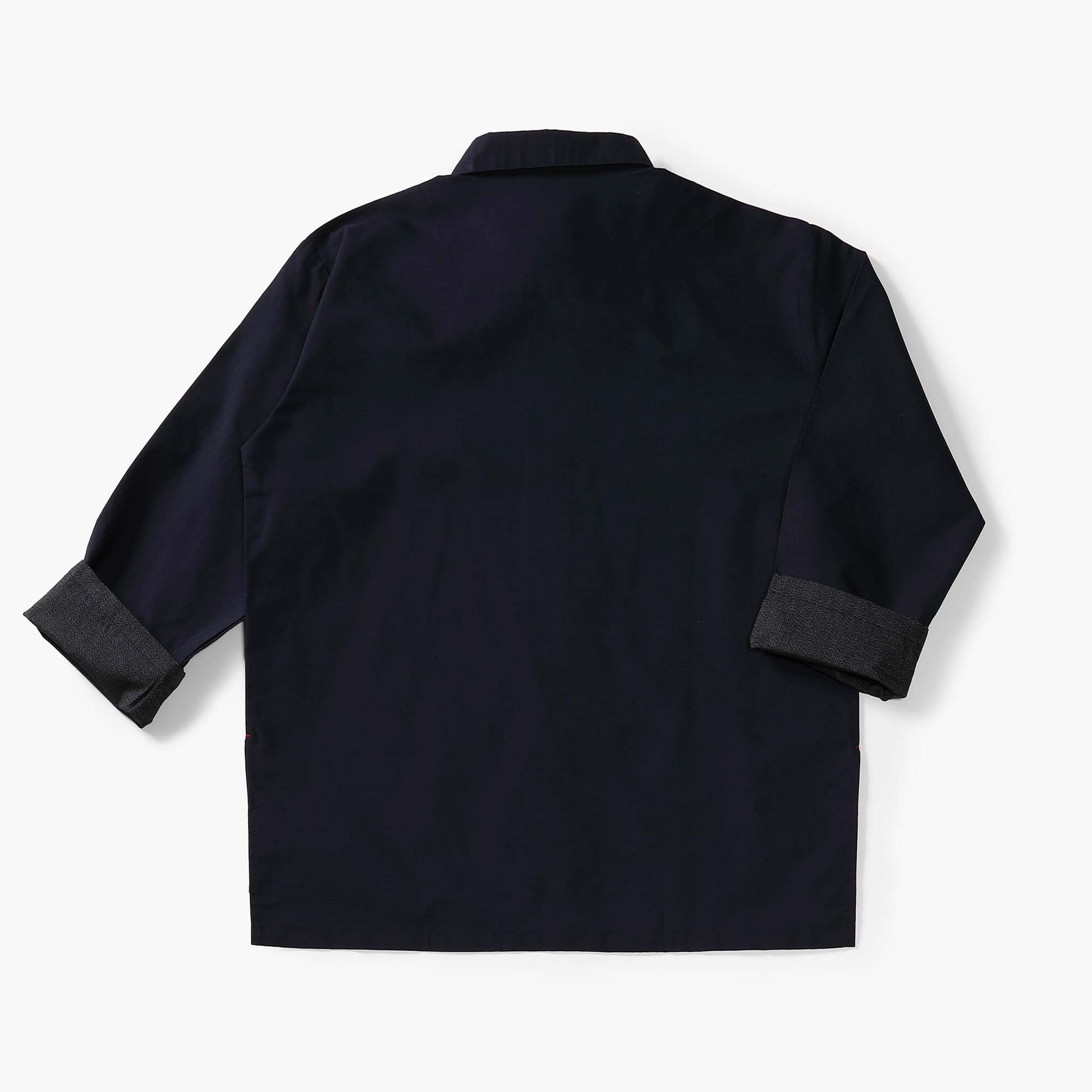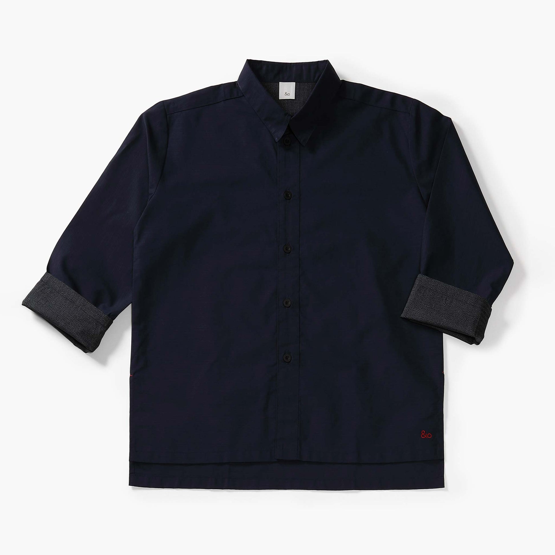 袖口も裾口も折り返すことができ、お好みの着回し可能な台襟付きシャツカラー